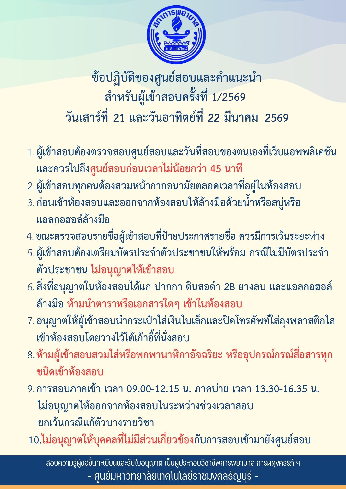 ข้อปฏิบัติของศูนย์สอบและคำแนะนำ สำหรับผู้เข้าสอบครั้งที่ 1/2569 วันเสาร์ที่ 21 และวันอาทิตย์ที่ 22 มีนาคม 2569