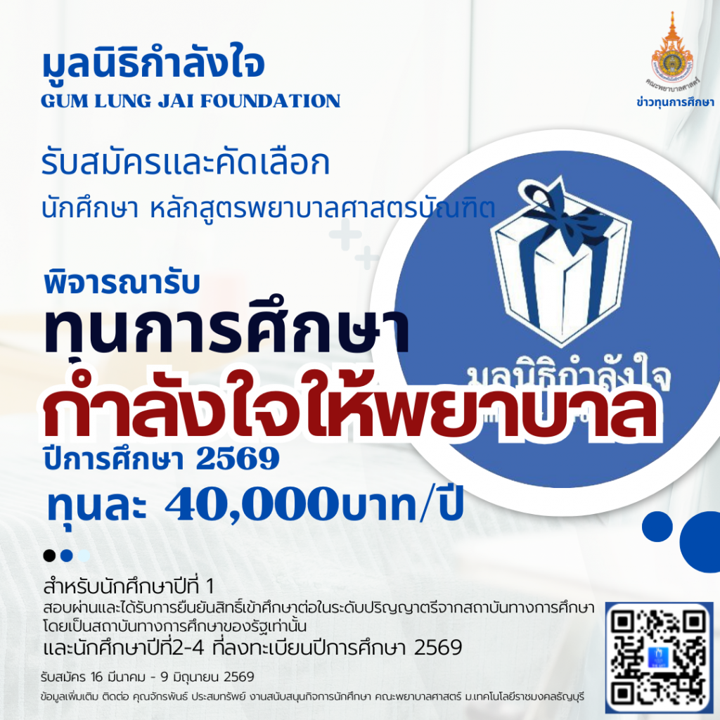 - สอบถามข้อมูลเพิ่มเติม ได้ที่คุณจักรพันธ์ ประสมทรัพย์ งานพัฒนานักศึกษา คณะพยาบาลศาสตร์ มหาวิทยาลัยเทคโนโลยีราชมงคลธัญบุรี